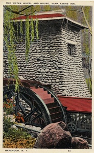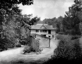 Sarre repeated her cobblestone base construction at two other buildings erected at the complex, a teahouse and a small building that housed a turbine, an overshot waterwheel and a pump. The latter structure, framed by drooping willows, also featured an Asian-style roof with upturned corners. Like the stables, the super-structure of the teahouse was built with native chestnut. American Homes and Gardens (1910) was enthusiastic in its praise for both the building and Sarre: