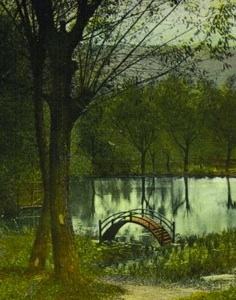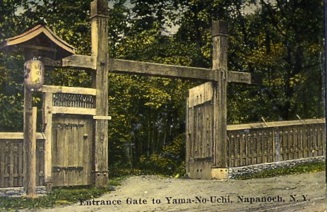 Entrance to Yama-no-uchi was through a Japanese gate with doors of solid wood, each ten feet high and hung on wrought iron hinges. Ideograms reading “Yama-no-uchi” adorned both a large lantern and the 12-foot high lantern stand that supported it. Once inside Yama-no-uchi, a series of walkways and roads guided the visitor through Japanese-style gardens that surrounded the five trout ponds. Near the center of the gardens, beneath the teahouse, Olive had placed an arched bridge and had it painted a deep red. The Sacred Bridge spanning the Daiya River in Nikko, Japan was said to have been its inspiration. According to Carlyle Ellis, the rare crimson lacquer used on the bridge had been obtained by Olive during her travels: