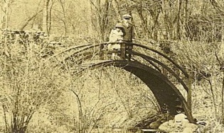 Views of the arched bridge known as the “Moon Bridge” or “Nikko Bridge.” It was painted with a rare crimson lacquer that Olive Sarre obtained in Japan. Standing on the bridge are Loren and Ruth Shull, children of L. Huber Shull, overseer of poultry farm operations at Yama Farms. Upper Left Photo Courtesy of Roger Shull.