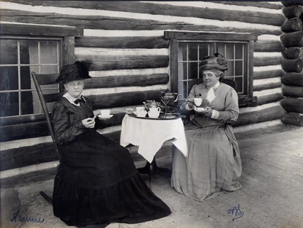 Olive Brown Sarre at right with her mother Eleanor Brown, taking tea at the Hut.