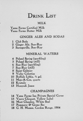 Guests at Yama Farms claimed that the buttermilk served with every meal was better than champagne. In fact, Yama Farms “certified milk” and buttermilk were so popular that they appear at the very top of the Inn’s drink list.