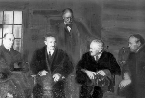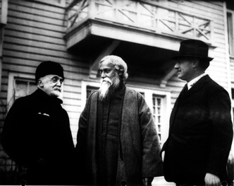 From left to right are Baron Roman Romanovitch Rosen, who served as the Russian ambassador to the United States and to Japan; Sir Rabindranath Tagore, the Indian poet-philosopher and winner of the 1913 Nobel Prize for Literature; and Arthur Hamerschlag, first president of the Carnagie Mellon Institute of Technology.