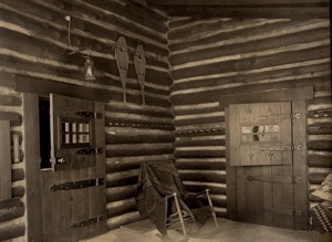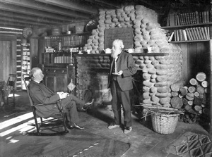 Frank Seaman, seated at left and John Burroughs at the Hut. Behind them is the fireplace with its famous inscriptions (see Welcome Page).