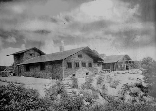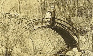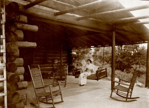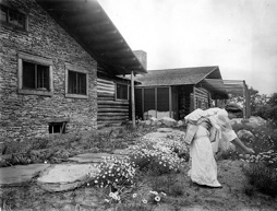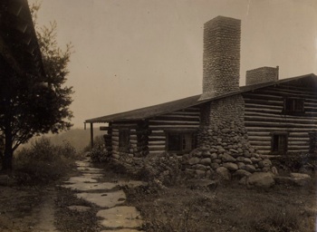 From the back porch of their home, the Hut, Sarre and Seaman had a view southeastward across Yama-no-uchi and the Rondout Valley, towards the Shawangunk Ridge. This residence, while not as overtly Japanese as the other Yama-no-uchi structures, reflected Japanese ideas of simplicity. The influence of the American Arts and Crafts movement could be seen in its log walls, gently sloping rooflines, and massive cobblestone chimneys. Adjoining it was a two-story masonry residence known as the Chalet. Seaman and Sarre entertained many guests at the Hut. Some were Seaman’s wealthy advertising clients, such as his old friend George Eastman, the founder of Eastman Kodak. Others were simply interesting people he and Sarre had collected along the way, such as fellow Ulster County resident, John Burroughs. “I like the house and their way of life,” Burroughs wrote to a friend, “I fancy I shall go there a good deal.” Although the conversation must have been lively, the ever-expanding circle of Seaman and Sarre’s friends would have made for crowded living conditions.